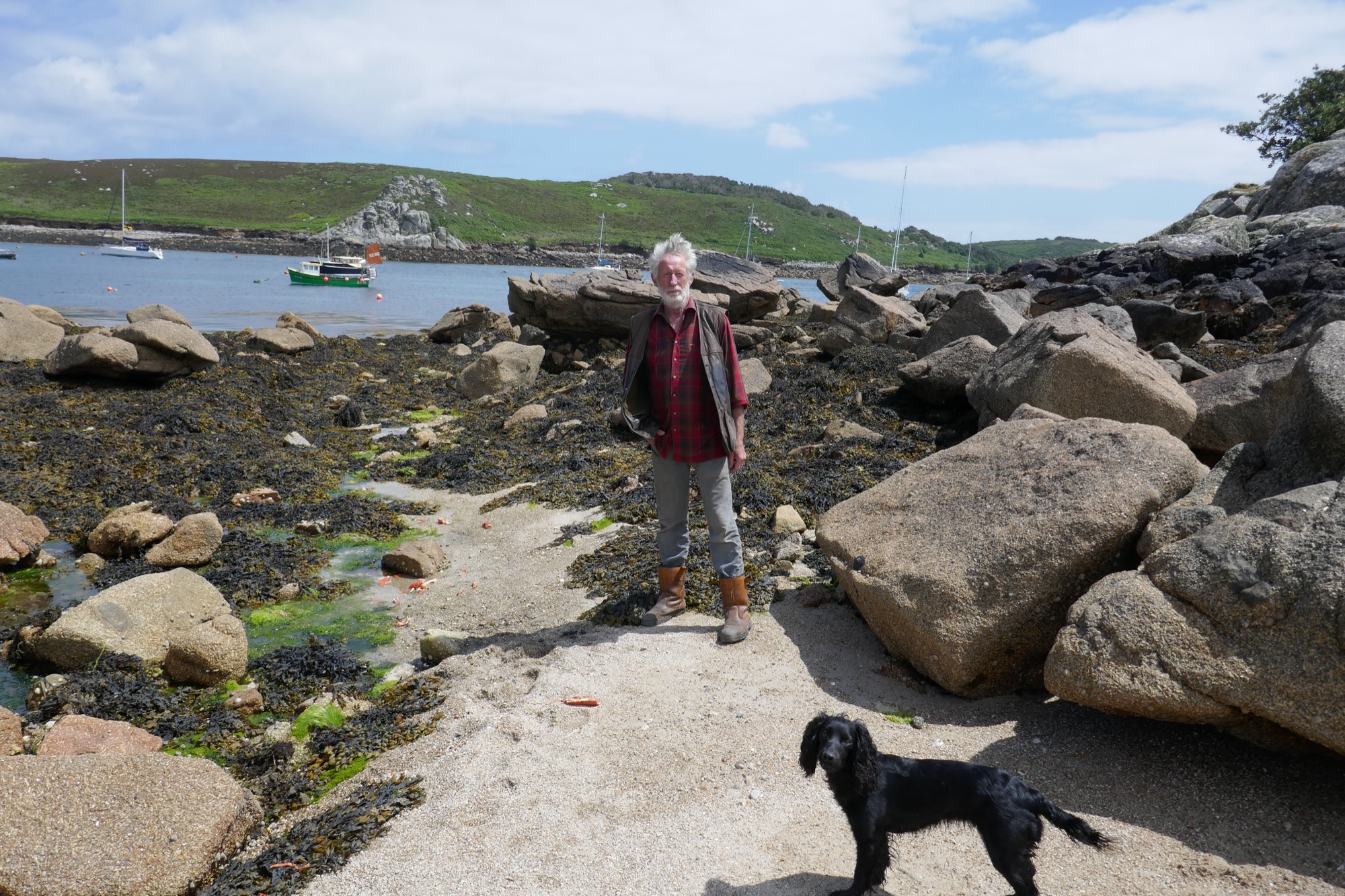 11: Richard Jenkins of Bryher at Rapid’s Drang, at Kitchen Porth, one of the ways made and used by his family and others for gigs or punts to pass through inter-tidal rocks. This drang served the Rapid, one of the pilot cutters that worked with gigs (information thanks to Mr Jenkins). Rapid carried to St Mary’s two men saved from the fatal wreck of the Delaware by the crew of the gig Albion in 1871 (see the Czar shed page). One of the rocks seen here on the right (south) side of the drang has a wedge splitting mark in its base, indicating it was worked before 1800.
