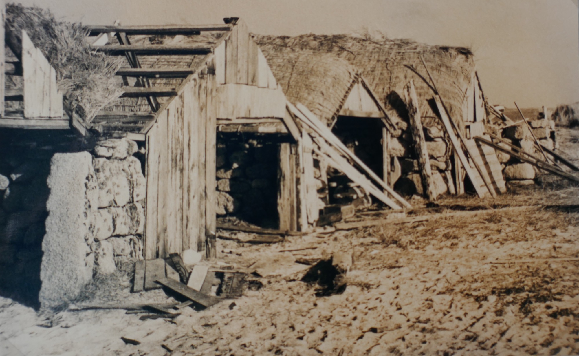 12: Gig sheds on Lower Town Par, St Martin’s in a photograph of 1930 preserved on St Martin’s. Reproduced thanks to Michael Tangye, who copied it there 50 years later courtesy of Mrs P. Howell. Features include the large-mesh rope nets made to help secure the thatch roofs, and splitting marks on the left doorpost (potentially of c1800, although the stone could be re-used).